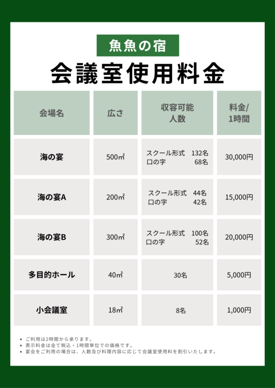 ・海の宴B(300㎡):スクール形式100名/口の字52名 1時間20,000円(税込)