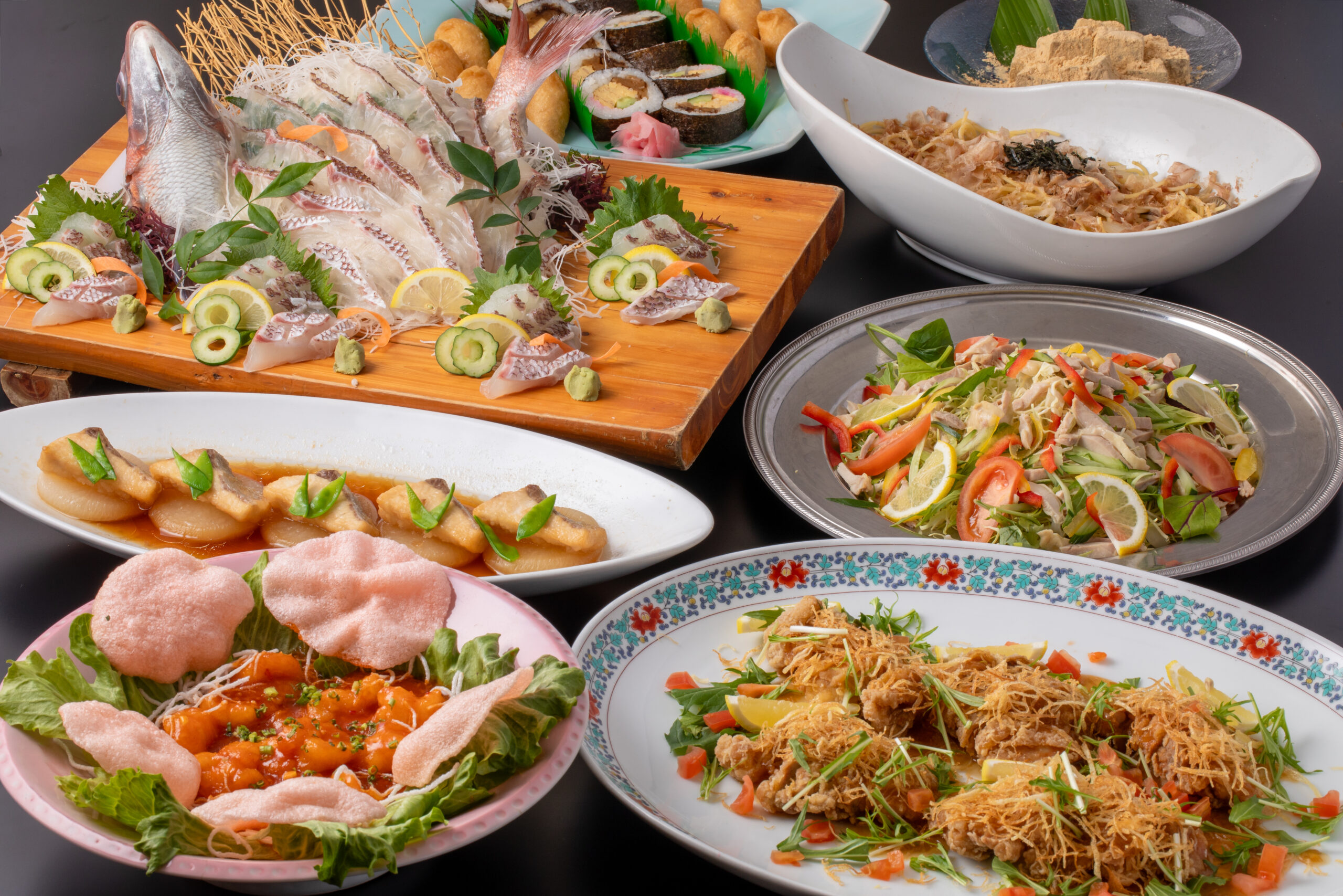 ・鯛の姿造り ・魚の揚げ煮 ・油淋鶏 ・エビチリ ・蒸し鶏の彩りサラダ ・おまかせパスタ ・助六 ・味噌汁 ・デザート