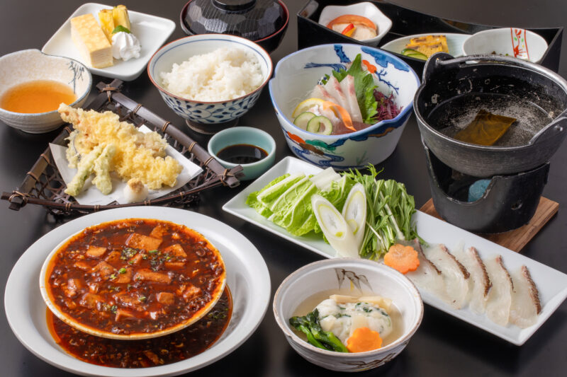 【料理長おすすめ会席】 前菜、刺身三種盛り(平政、鯛、鮪)、海老と春野菜の天ぷら、 はまぐり真丈菜の花添え、鯛しゃぶ、こぼれ麻婆豆腐、 白飯、味噌汁、デザート